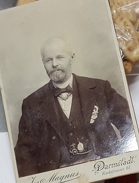Собираю я фотографии с усердиями, это да. Также собираю фотографии с различными медалями немецких государств. На этой фотографии помимо шейного усердия российского мы видим гессенскую выслугу, свадебную медаль герцога Эрнста Людвига и прусскую медаль ордена Красного Орла. По адресу фотомастерской понятно, что дело было в Великом Герцогстве Гессенском, в его столице Дармштадте.
